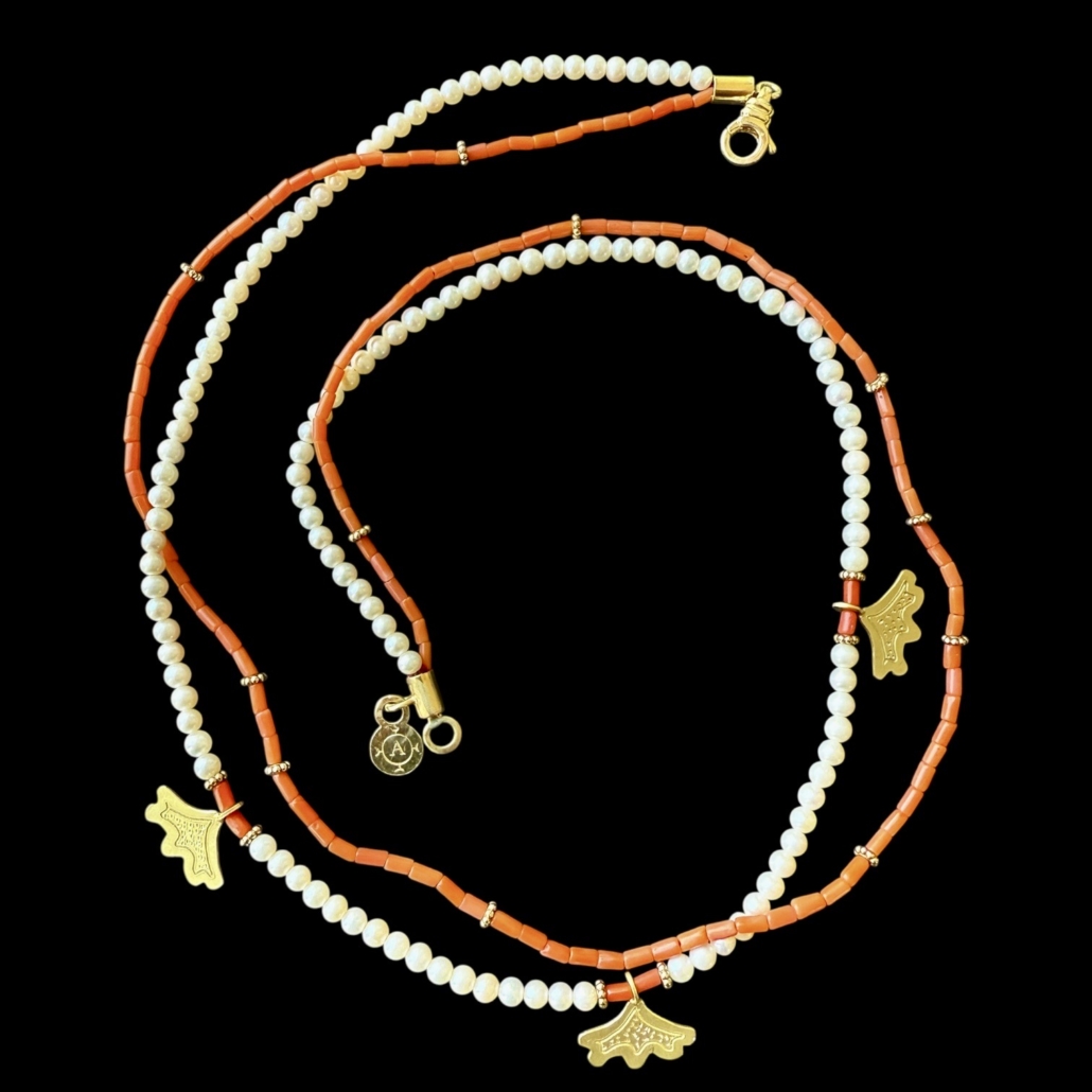 18k yellow gold, Mediterranean coral, Japanese Pearls. 18″ long